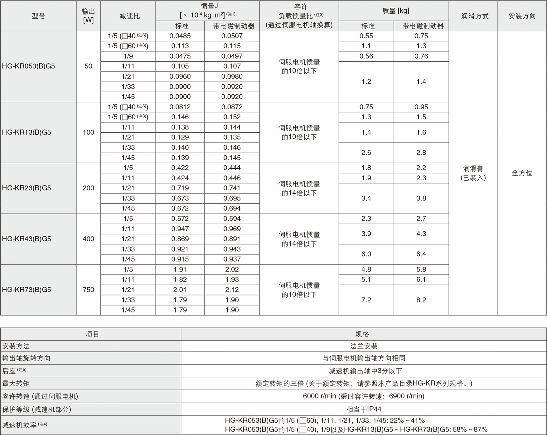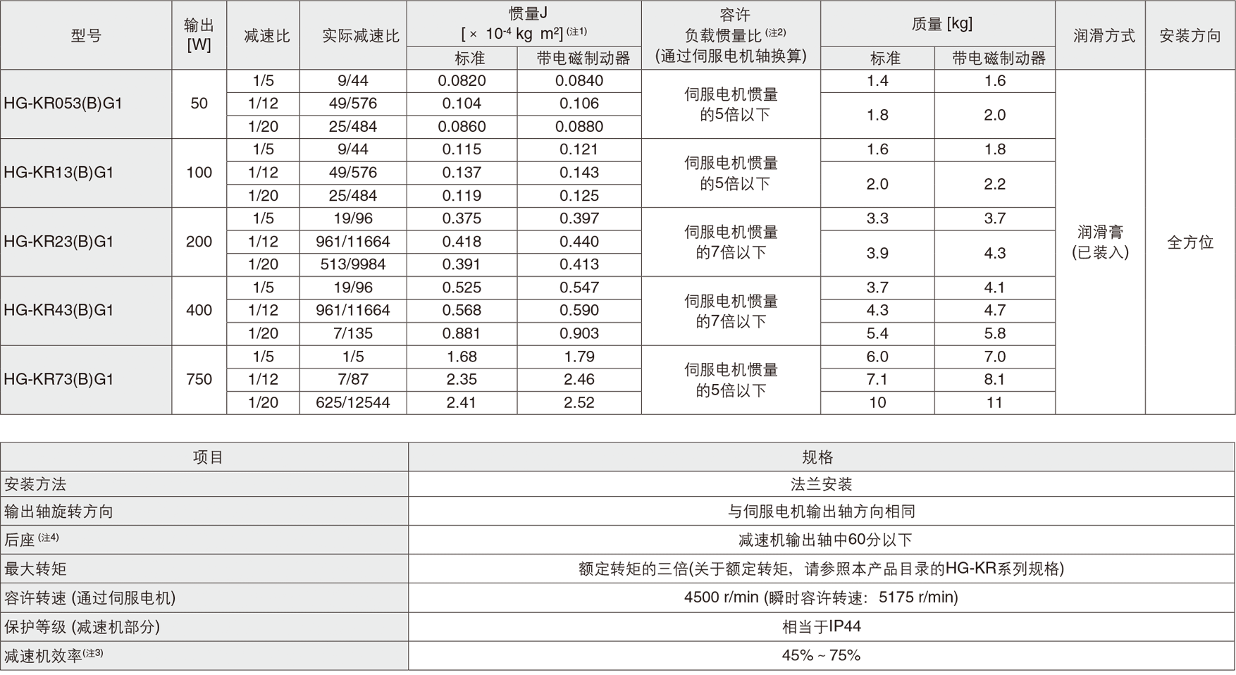 4.减速机效率根据减速比的变化而变化。另外,减速机效率还取决于输出转矩、转速,温度等使用环境表中的数值为额定转矩、额定转速及常温的代表值,并非保证值。