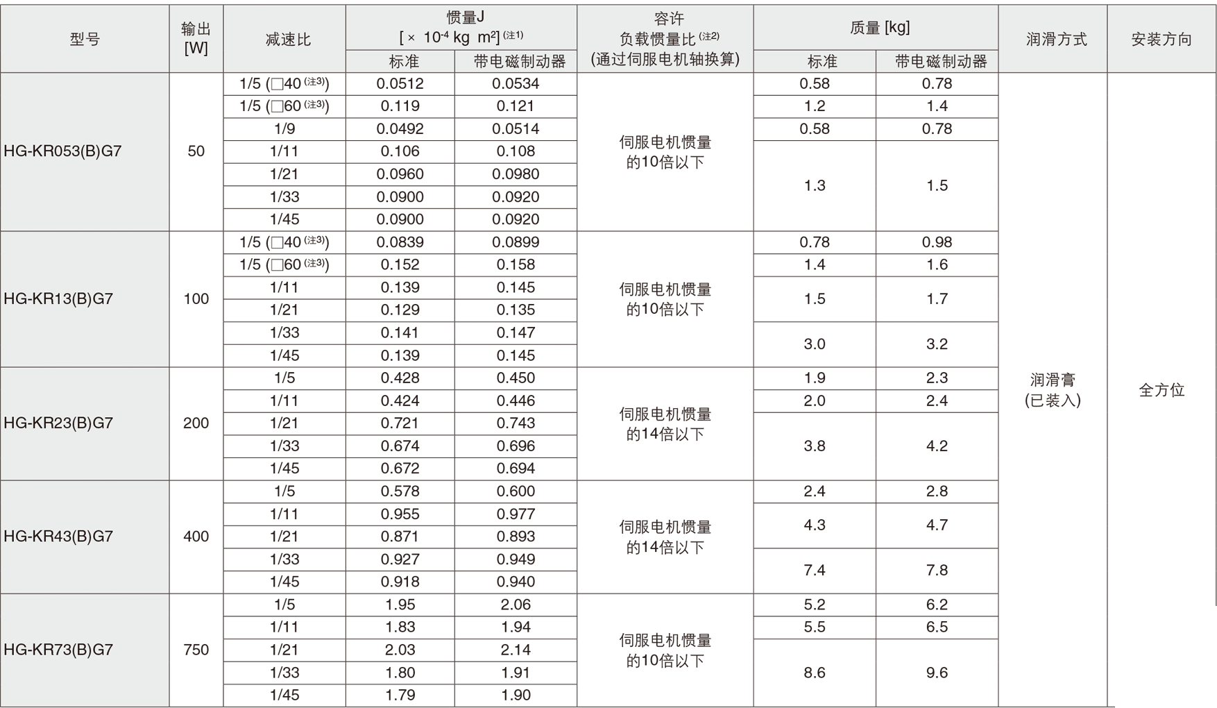 注)1.惯量为,伺服电机+减速机(+电磁制动器)的伺服电机轴换算值。